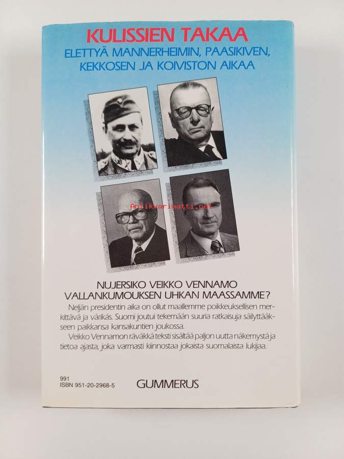 Kulissien takaa. Elettyä Mannerheimin, Paasikiven, Kekkosen ja Koiviston aikaa. 1987. VVn räväkkää tekstiä, nujersiko hän vallankumouksen Suomessa?