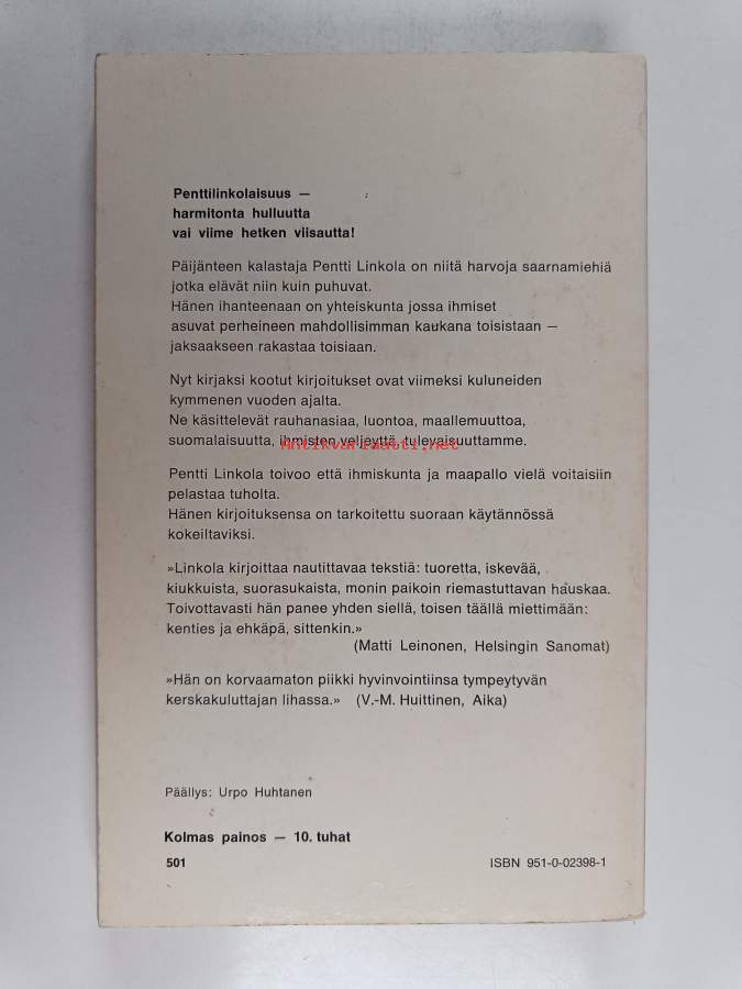 Hyvä. Tarkempi kuntoluokka: K3- ; Pienoista tahraisuutta kansissa, hieman kulumaa kansissa, selkämyksessä hieman vinoutta. pienoista pintarepeämää etukannen ja ensimmäisen sivun taitteessa