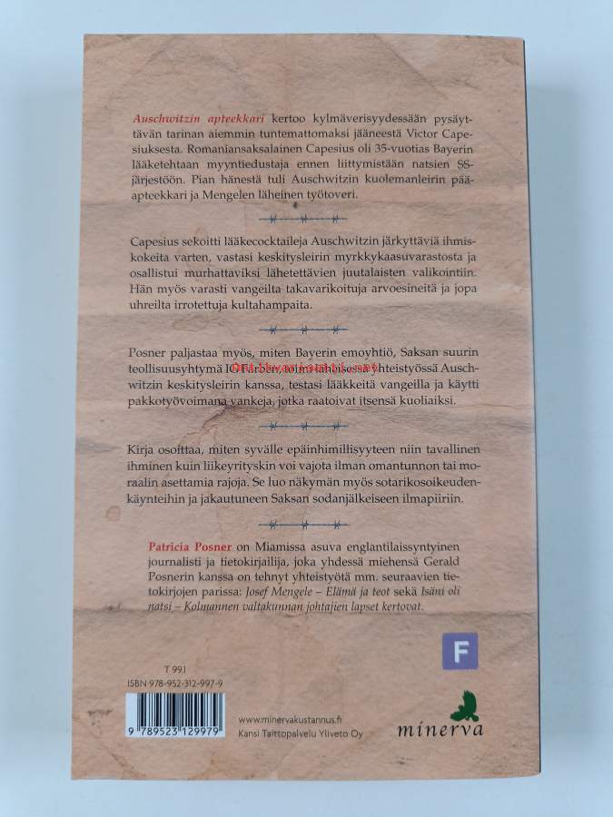 Muu(t) tekijä(t): Niko JääskeläinenAlkuteos: The pharmacist of AuschwitzAsiasanat: historia, toinen maailmansota, lääkkeet, keskitysleirit, joukkotuho, holokausti, oikeudenkäynti, yhteistyö, kemianteollisuus, natsit, kolmas valtakunta, testaus, sotarikokset, lääketieteelliset kokeet, ihmiskokeet, sotarikolliset, proviisorit
