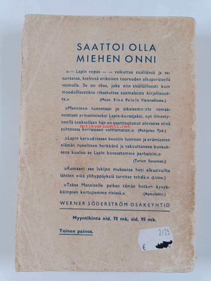 Hyvä. Tarkempi kuntoluokka: K3- ; Pientä kulumaa, pientä repeämää selkämyksen päissä, hieman taitejälkeä etukannessa, hieman läikkää, takana vanha hintalappu
