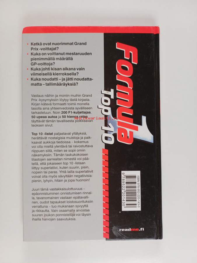 Muu(t) tekijä(t): Tapani LahtinenAlkuteos: The book of formula 1 : top tensAsiasanat: hakuteokset, ennätykset, formula, Formula 1 -luokka