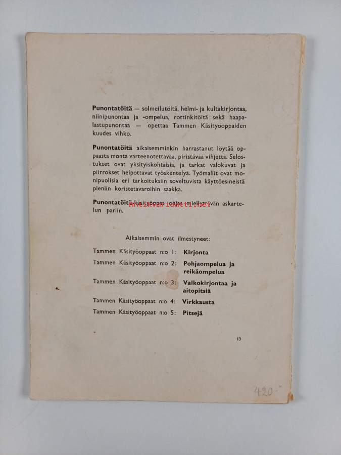 Muu(t) tekijä(t): Raija LahtiSarja: Tammen käsityöoppaat n:o 6Asiasanat: solmeilu, punontatyöt, rottinkityöt, niinityöt, helmikirjonta