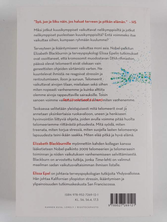 Muu(t) tekijä(t): Teija Hartikainen, Elissa EpelAlkuteos: The telomere effectAsiasanat: terveyskäyttäytyminen, elintavat, ikääntyminen, ikä, DNA, solut, pitkäikäisyys, elinvoimaisuus, kromosomit, telomeerit