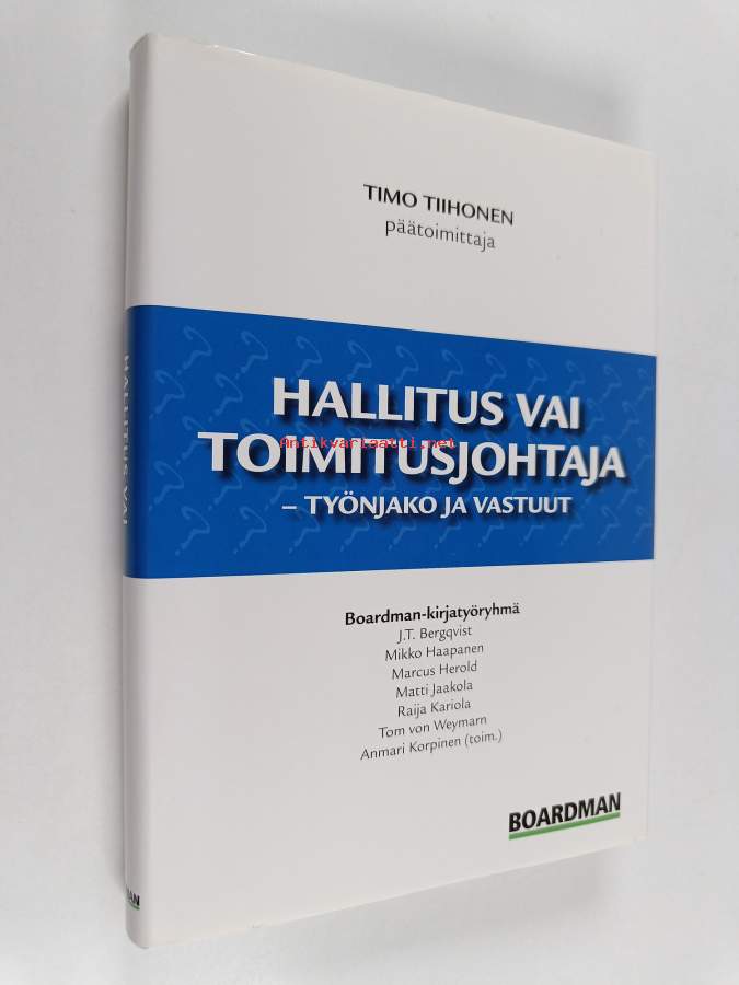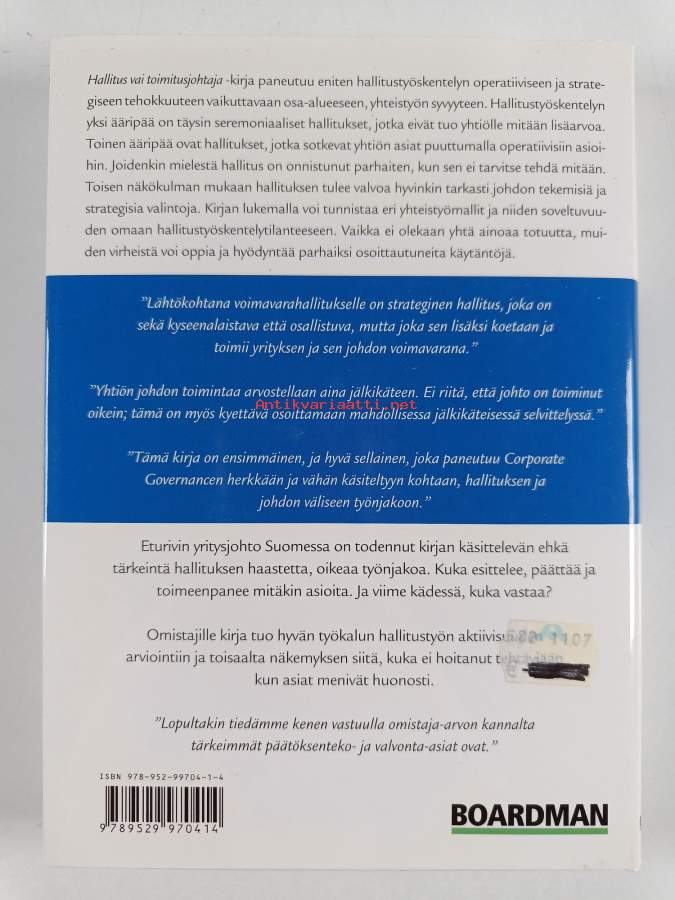 Muu(t) tekijä(t): J. T. Bergqvist, Mikko Haapanen ym.Asiasanat: hallitukset, yritykset, johtaminen, johtajat, päätöksenteko, vastuu, liikkeenjohto, toimitusjohtajat, yhteistyö, organisaatiot, hallinto, valvonta, riskienhallinta, omistajaohjaus, strategiat, työnjako, hallitukset (yhteisöt)