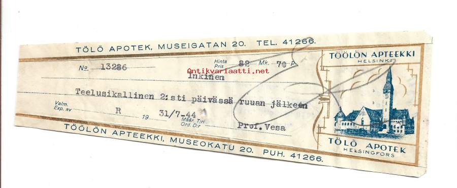 Töölön Apteekki Helsinki- resepti signatuuri 1944