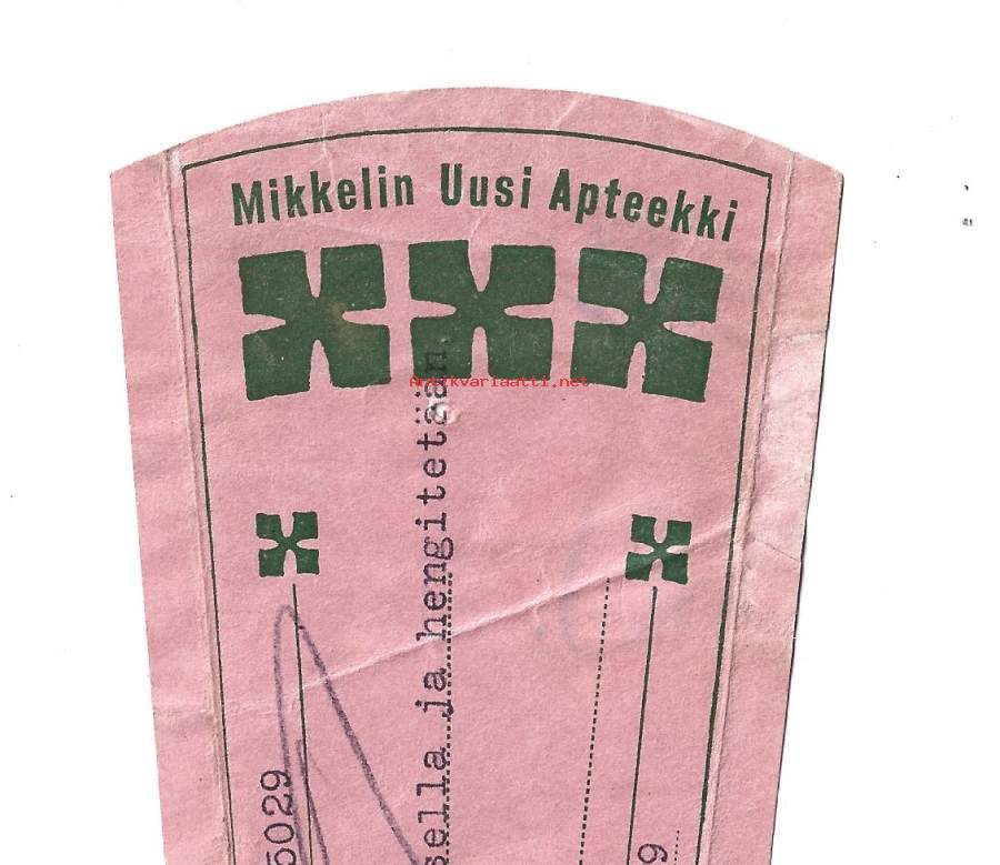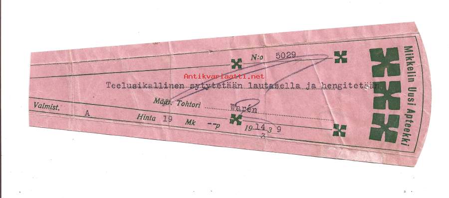 Mikkelin Uusi Apteekki , resepti signatuuri 1939