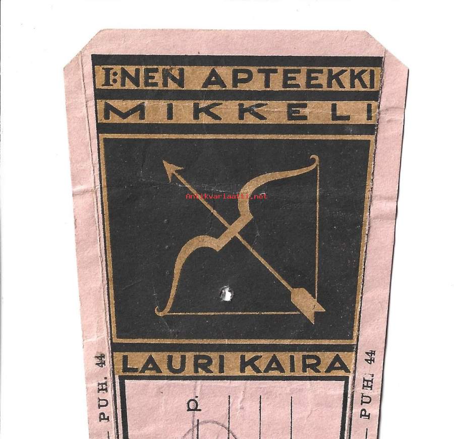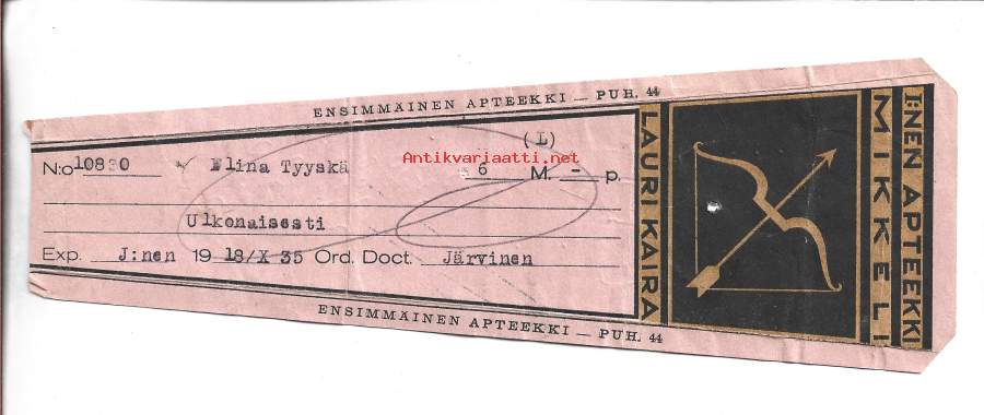 I:nen Apteekki Mikkeli Lauri Kaira , resepti signatuuri 1935