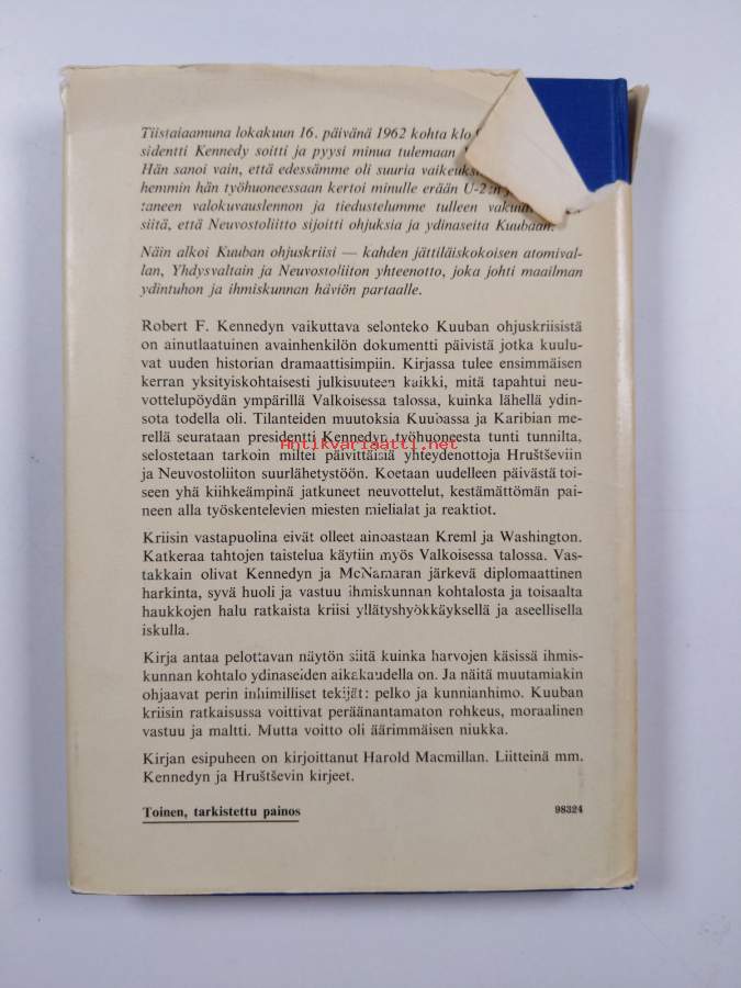 Kennedy, Robert F. Teos: [Thirteen days] Nimeke: 13 päivää kuilun partaalla : Kuuban kriisin päiväkirja / Harold Macmillanin kirjoittama esipuhe ; Suom.