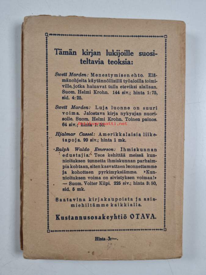 Menestymisen ehto : elämänohjeita liikeapulaisille ; Pyri eteenpäin, menestys varma : innostuksen ja rohkaisun kirja jokaiselle, joka tiedon ja velvollisuuden tie...