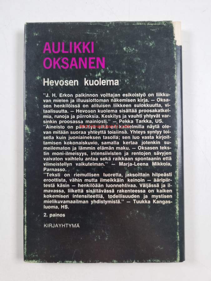 Hyvä. Tarkempi kuntoluokka: K3+ ; Hieman nuhruisuutta kansissa, selkämyksessä hieman vinoutta. Kansipaperin kunto: joitain repeämiä/kulumaa