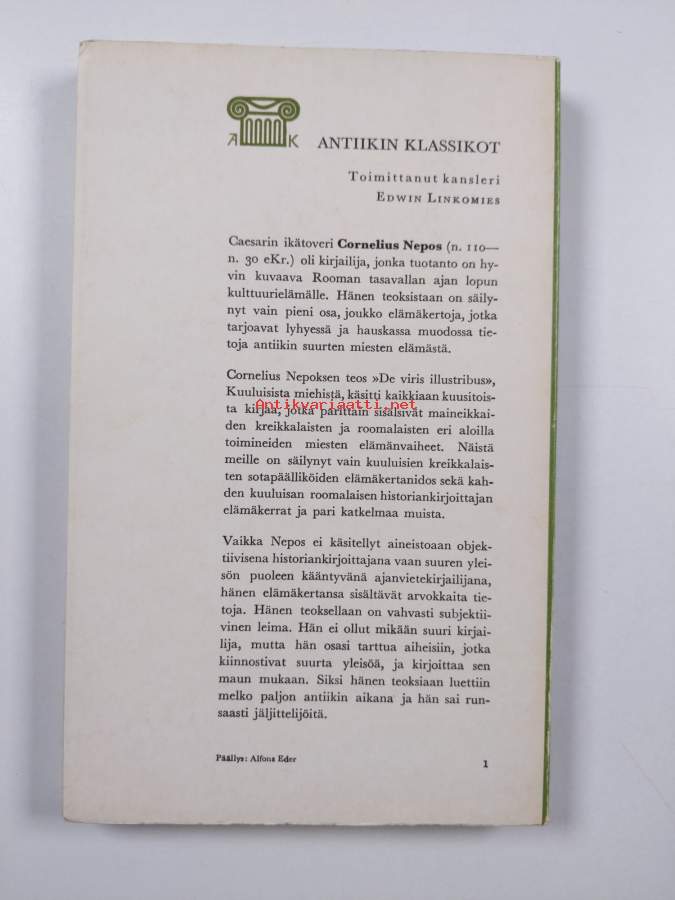 Muu(t) tekijä(t): Jaakko Suolahti, Marja ItkonenMerkinnät: omistajamerkintäSarja: Antiikin klassikotAlkuteos: De viris illustribusAsiasanat: antiikki, latinankielinen kirjallisuus, suomenkielinen käännöskirjallisuus