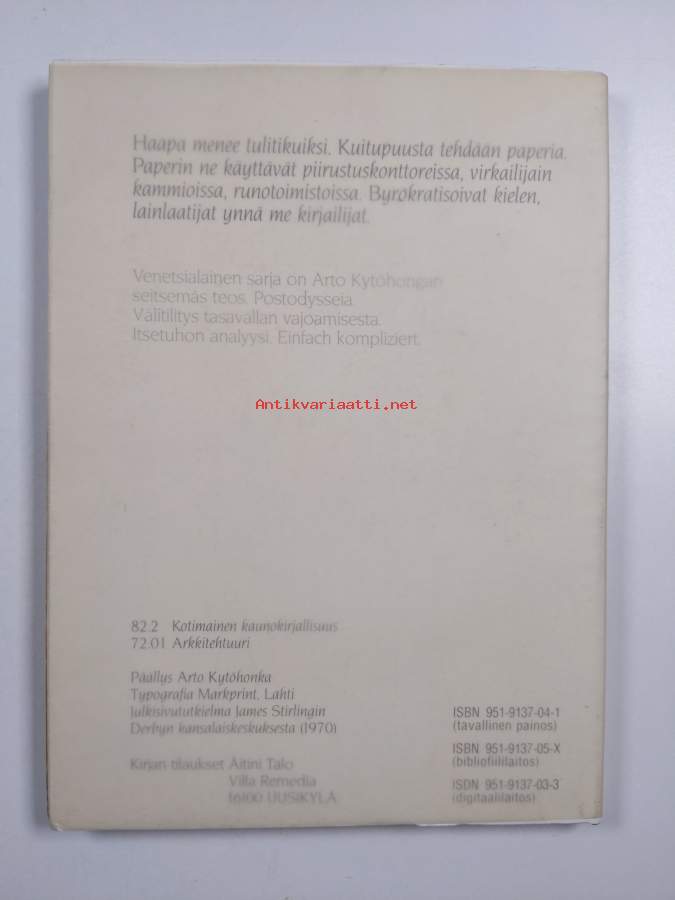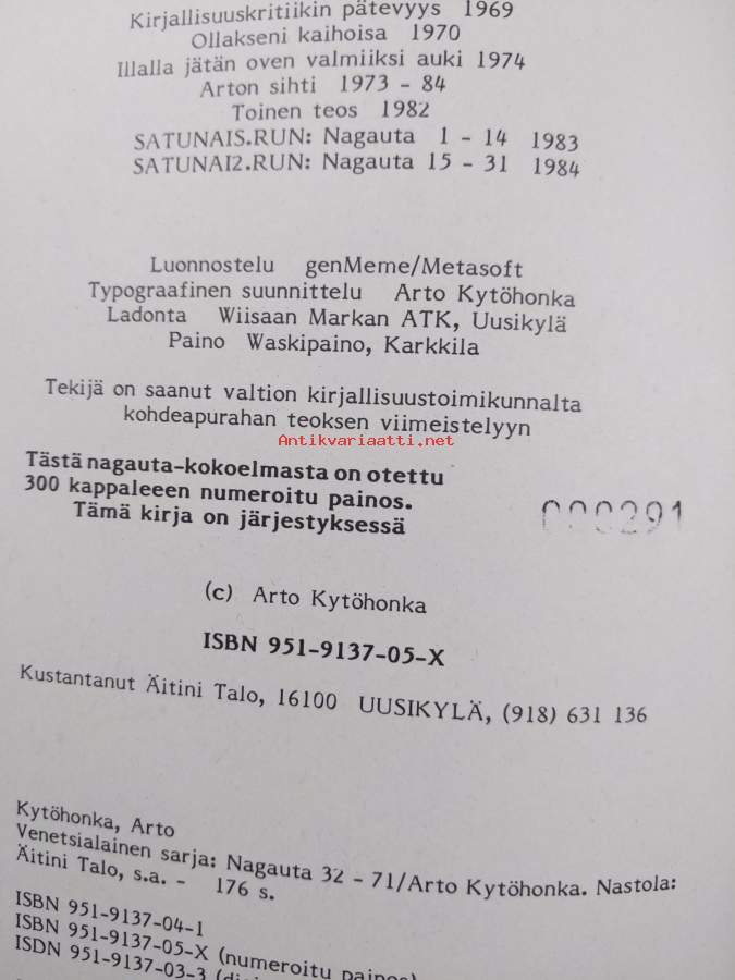 Hyvä. Tarkempi kuntoluokka: K3+ ; Hieman käytön jälkeä kansissa, selkämyksessä aavistus vinoutta. Kansipaperin kunto: jonkin verran kulumaa/pienoisia repeämiä / nro 291/300