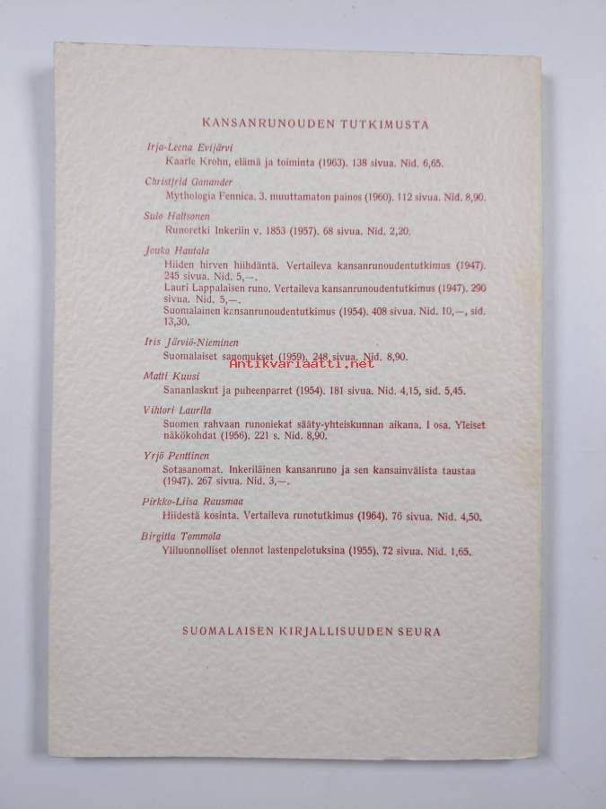Merkinnät: omistajamerkintä (leima)Sarja: Suomalaisen Kirjallisuuden Seuran toimituksia 282Asiasanat: kansanrunous, arvoitukset, folkloristiikka