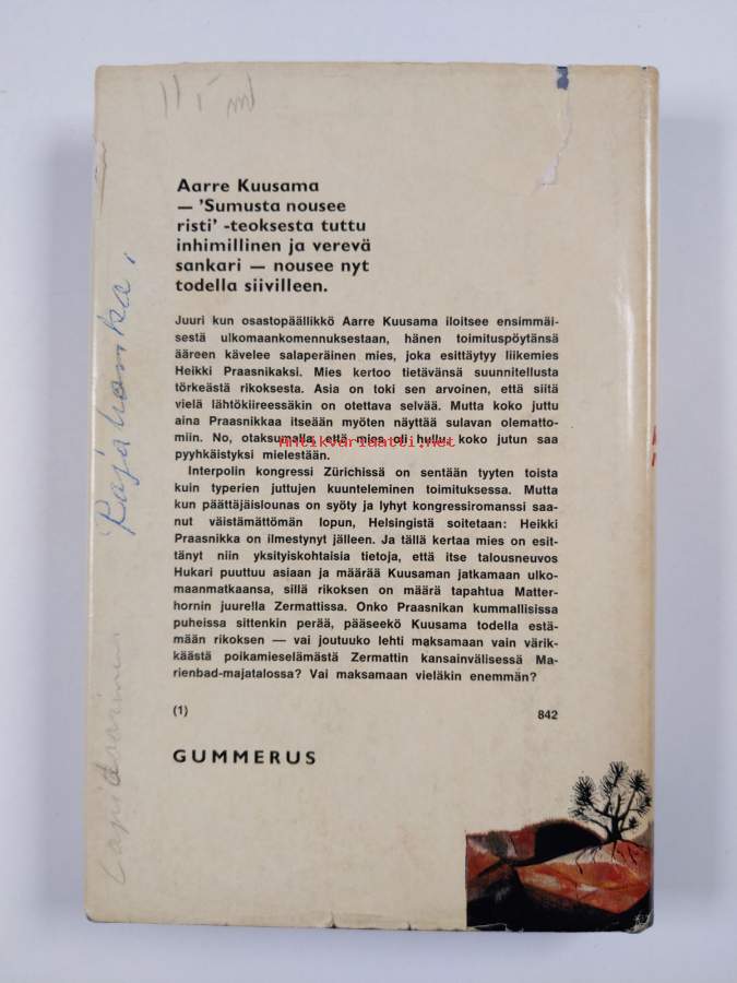 Hyvä. Hieman kolhua reunoilla ja kulmissa, selkämyksessä vinoutta. Kansipaperin kunto: joitain repeämiä/kulumaa