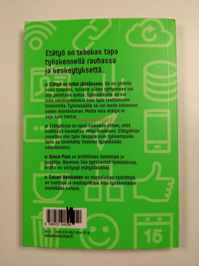 Muu(t) tekijä(t): Laura Haavisto, Sakari HeiskanenAlkuteos: The ultimate guide to working from homeAsiasanat: työtavat, työprosessit, etätyö, työvälineet, organisointi, arbetssätt, distansarbete, arbetsredskap, organisering, arbetsprocesser