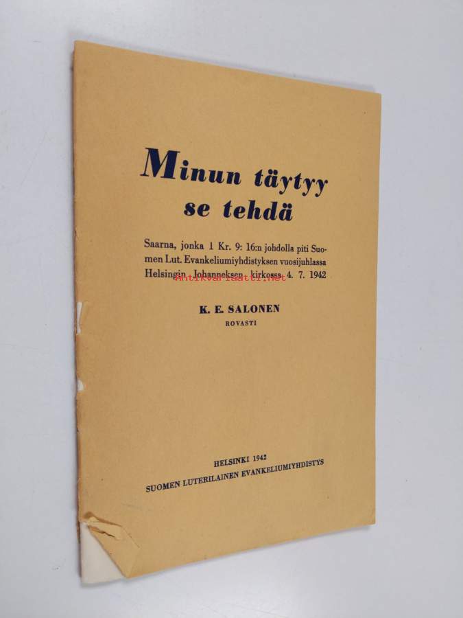 Minun täytyy se tehdä : saarna 1 Kr. 9: 16:n johdolla Suomen lut. evankeliumiyhdistyksen vuosijuhlassa Helsingin Johanneksen kirkossa 4.7.1942