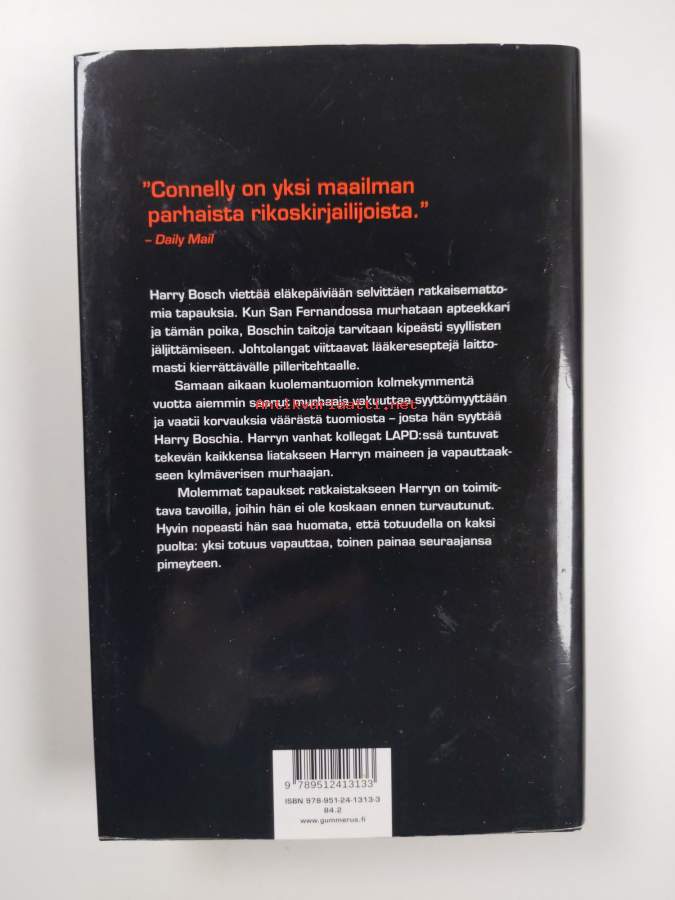 Muu(t) tekijä(t): Raimo SalminenMerkinnät: omistajamerkintäSarja: Harry Bosch -sarja [18Alkuteos: Two kinds of truthAsiasanat: murha, oikeusmurha, kaupungit, lääkkeet, väärinkäyttö, apteekkarit, yksityisetsivät, syytökset