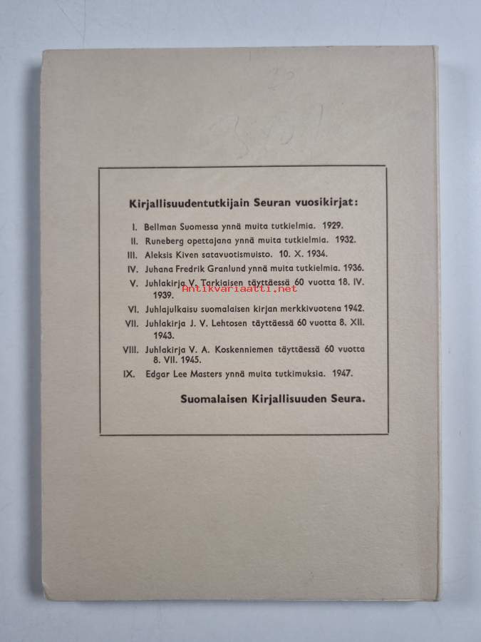 Muu(t) tekijä(t): Rafael Koskimies, Sulo HaltsonenMerkinnät: omistajamerkintä & exlibris: P. A-OSarja: Kirjallisuudentutkijain seuran vuosikirja IXAsiasanat: kirjallisuudentutkimus