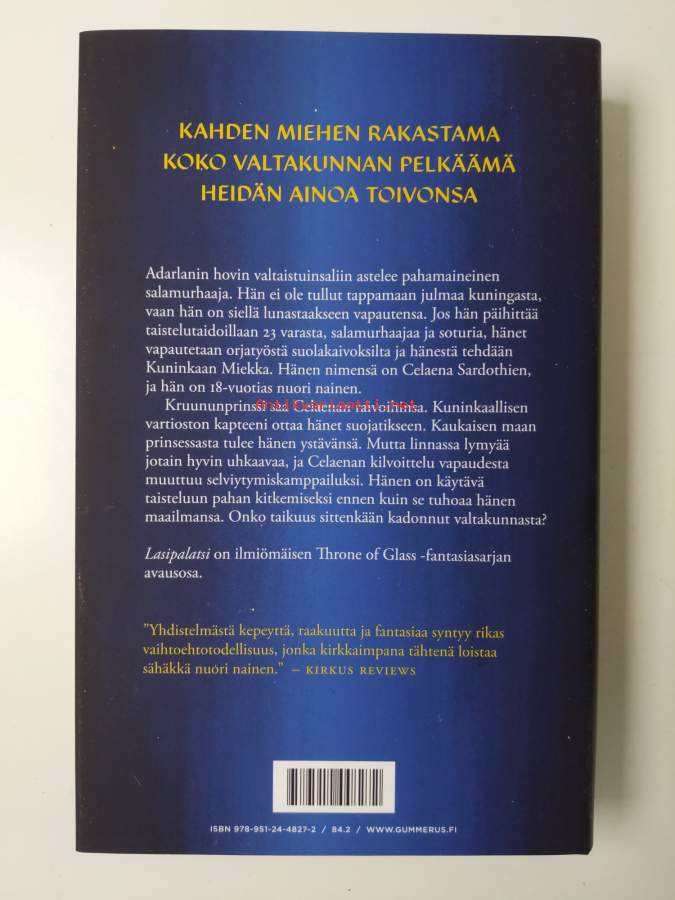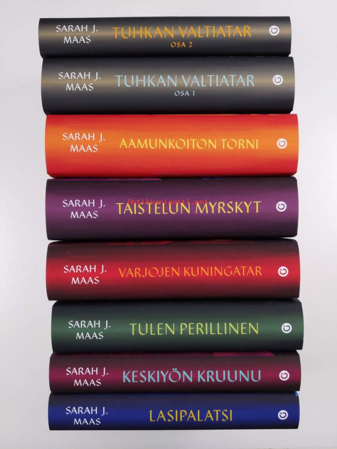 Koko nimi: Throne of Glass 1-8 : Lasipalatsi ; Keskiyön Kruunu ; Tulen Perillinen ; Varjojen kuningatar ; Taistelun Myrskyt ; Aamunkoiton torni ; Tuhkan Valtiatar Osa 1 ; Tuhkan Valtiatar Osa 2Asiasanat: Lasipalatsi