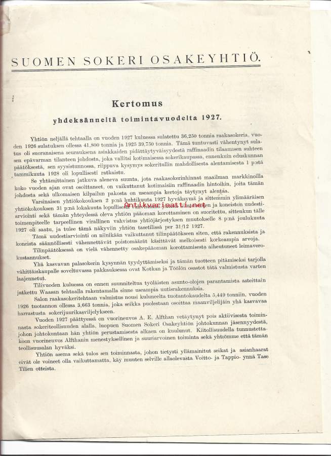 Suomen Sokeri Oy - vuosikertomus vuodelta 1927