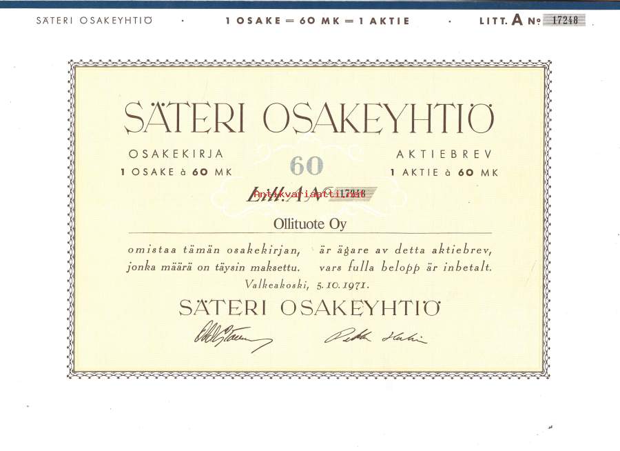 Säteri Oy osakekirja, Valkeakoski 1971 merkitty Ollituote Oy