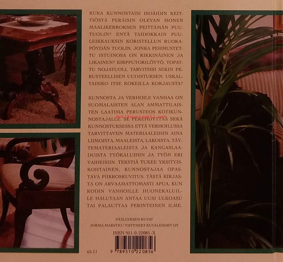 Teos on verhoilijan ja entisöijän yhdessä laatima perusteos vanhojen huonekalujen kotikunnostajalle. Teos perehdyttää lukijansa kunnostuksessa tarvittaviin materiaaleihin, työkaluihin ja työn eri vaiheisiin. Teoksesta hyötyvät niin aloittelijatkin kuin jo pitkälle ehtineetkin. Kuvitettu. Dimensiot 25 * 17 cm.