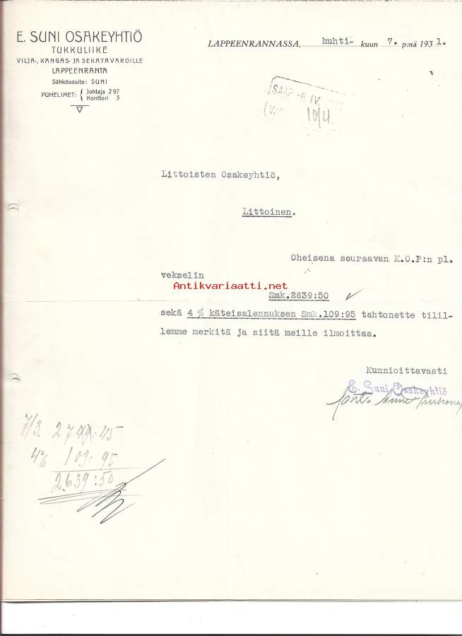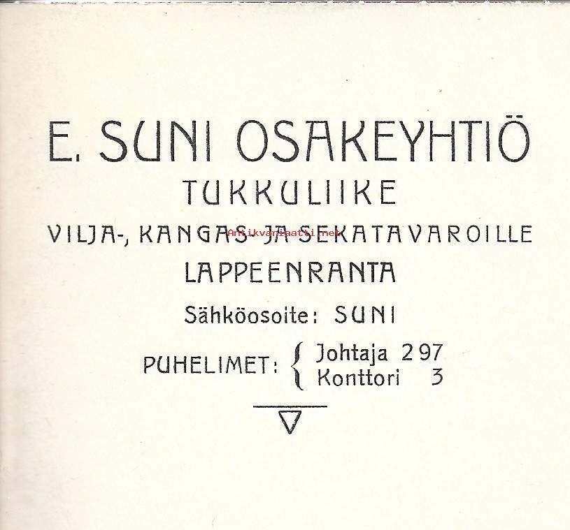 E Suni Oy Tukkuliike Lappeenranta 1931 firmalomake