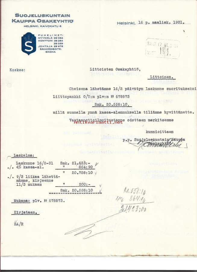 Suojeluskuntain Kauppa Oy Helsinki 1931- firmalomake