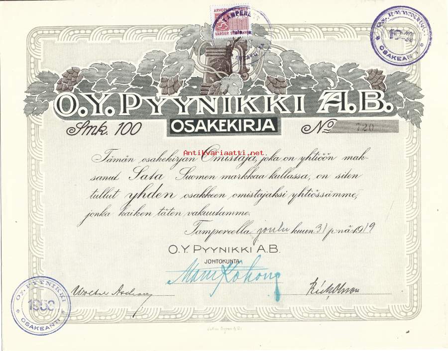Pyynikki Oy, osakekirjaTampere 1919 merkitty