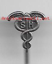 The object in the image is a US Navy Hospital Corpsman Utility Ball Cap Badge. This type of badge is a piece of militaria, specifically a uniform accessory worn by members of the US Navy Hospital Corps.Origin: United States NavyPurpose: The badge is worn on a ball cap to identify the wearer's occupational specialty.Symbolism: The badge features a caduceus, which is a symbol commonly associated with medicine and healthcare. The letters "SH" stand for "Ship's Hospital" or "Sickbay".