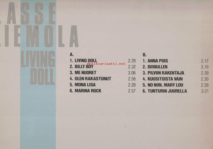Living doll (Lionel Bart/ Lala ( = Lasse Liemola))Billy boy (Trad./ Veikko Vallas ( = Sauvo Puhtila))Me nuoret (Sid Tepper & Roy Bennett/ Lala)Olen rakastunut (Paul Anka/ Mauno Maunola)Mona Lisa (Jay Livingston & Ray Evans/ Usko Kemppi)Marina (Rocco Granata/ Saukki ( = Sauvo Puhtila))Anna pois (Trad./ Lala)Diivaillen (Norman Cazden & Anthony Donegan/ Lala)Pilviinrakentaja (Buck Ram/ Saukki)Kuusitoista vain (Barbara Campbell/ Merja ( = Sauvo Puhtila))No niin, Mary Lou (Gene Pitney/ Kari Tuomisaari)Tunturin juurella (Trad./ Merja)-Sovitukset Antti Hyvärinen-postipaketti