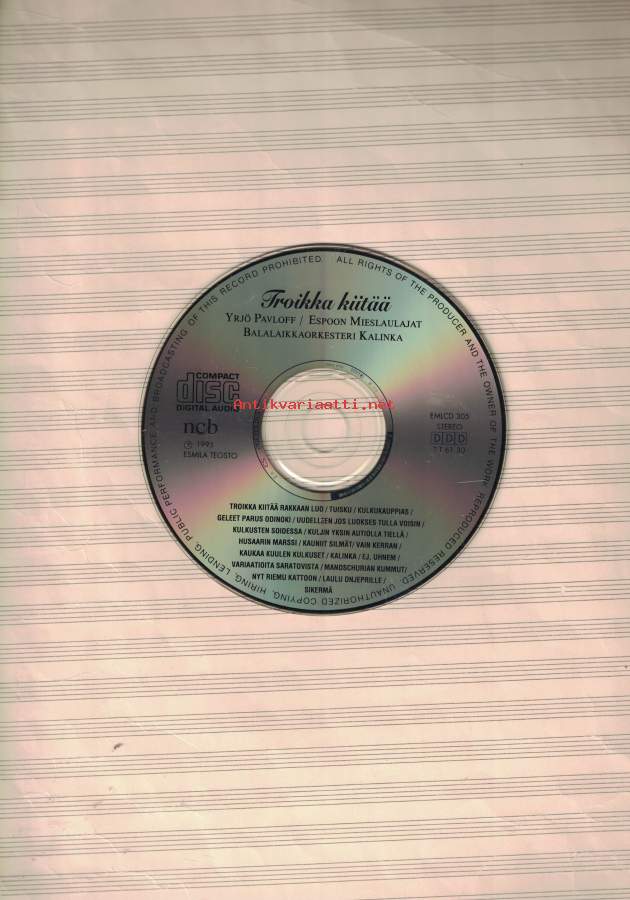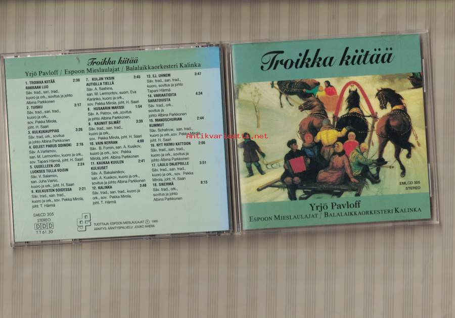 Conductor [Choir & Orchestra] – Albina Parkkonen (tracks: 1, 3, 8, 10, 11, 14, 16, 18a to 18i)Conductor [Choir & Orchestra] – Heikki Saari (tracks: 1, 4, 5, 7, 9, 15, 17)Conductor [Choir & Orchestra] – Tapani Härmä (tracks: 6, 12, 13)1 Troikka Kiitää 2:302 Tuisku 3:173 Kulkukauppias 3:264 Geleet Parus Odinoki 2:165 Uudelleen Jos Luokses Tulla Voisin 2:246 Kulkusten Soidessa 2:217 Kuljin Yksin Autiolla Tiellä 3:458 Husaarin Marssi 1:549 Kauniit Silmät 3:3910 Vain Kerran 4:0011 Kaukaa Kuulen Kulkuset 2:4112 Kalinka 3:4813 Ej, Uhnem 3:4714 Variaatioita Saratovista 4:3415 Mandschurian Kummut 2:4416 Nyt Riemu Kattoon 2:0617 Laulu Dnjeprille 3:51Sikermä (8:15)18aMoskovan Illat18bKazatshok18cVolgan Lautturien Laulu18dMustanmeren Valssi18ePelto18fAukea Pelto18gMurheisna Miesnä18hMoskovan Ikkunat18iLoistaa Kirkas Kuu-Pieni Helposti kuori