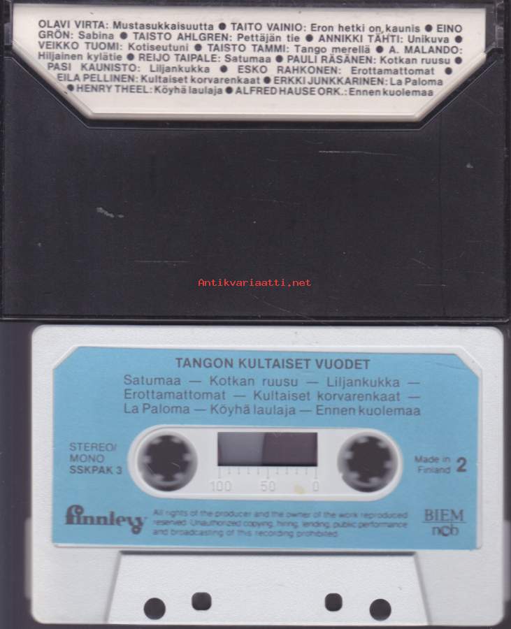**A1 Olavi Virta– Mustasukkaisuutta = Jalousie3:16*A2 Taito Vainion Tango-Orkesteri– Eron Hetki On Kaunis2:41*A3 Eino Grön– Sabina3:25*A4 Taisto Ahlgren– Pettäjän Tie3:12A5 Annikki Tähti– Unikuva2:50*A6 Veikko Tuomi– Kotiseutuni2:30*A7 Taisto Tammi– Tango MerelläComposed By – T. Kärki*Lyrics By – R. Helismaa*3:00*A8 A. Malando*– Hiljainen Kylätie = A Quiet Country Road3:01*B1 Reijo Taipale– Satumaa2:55*B2 Pauli Räsänen– Kotkan Ruusu3:25*B3 Pasi Kaunisto– Liljankukka2:50*B4 Esko Rahkonen– Erottamattomat2:20*B5 Eila Pellinen– Kultaiset Korvarenkaat = Golden Earrings1:59*B6 Erkki Junkkarinen– La Paloma3:15*B7 Henry Theel– Köyhä Laulaja3:06*B8 Alfred Hause Orkestereineen*– Ennen Kuolemaa = Avant De MourirWritten-By – G. Boulanger*2:53**