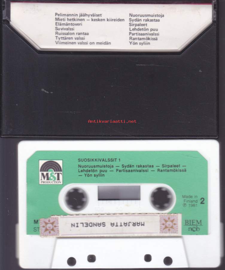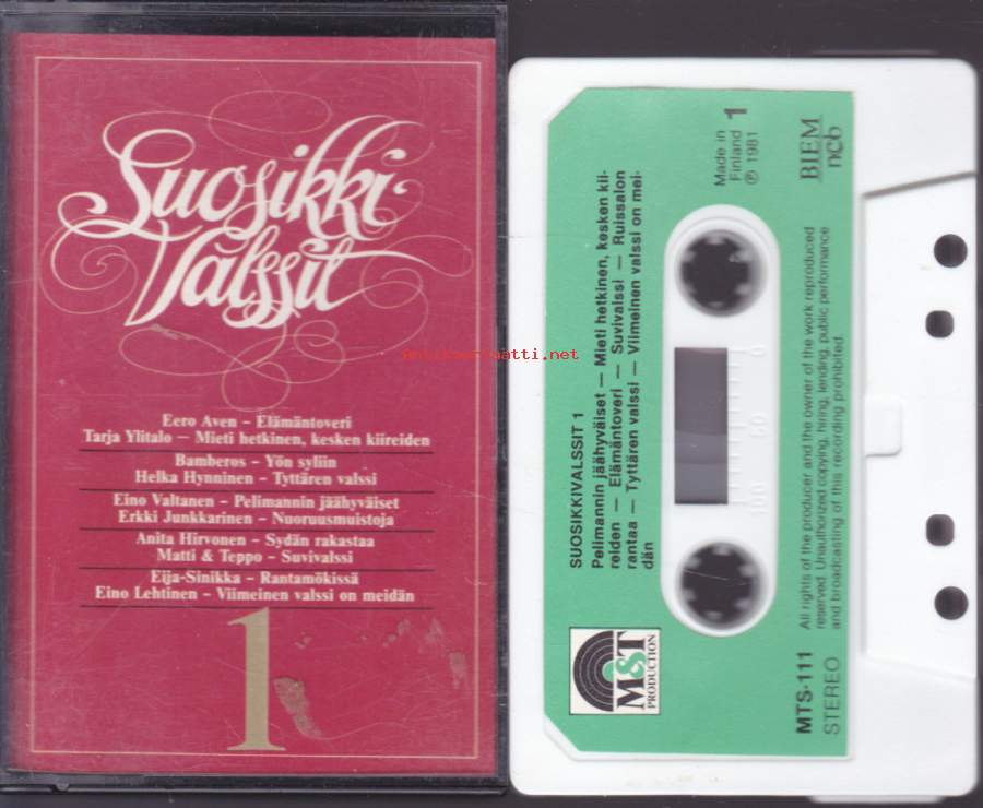 **A1 Eino Valtanen– Pelimannin JäähyväisetComposed By, Lyrics By – T. Honkonen*3:00*A2 Tarja Ylitalo– Mieti Hetkinen - Kesken KiireidenComposed By, Lyrics By – S. Leino*2:55*A3 Eero Aven– ElämäntoveriComposed By – L. Vitikka*Lyrics By – E. Aven*3:08*A4 Matti & Teppo*– SuvivalssiComposed By, Lyrics By – R. Lumisalmi*3:25*A5 Turuttaret– Ruissalon RantaaComposed By, Lyrics By – M. Tammenlaakso*3:23*A6 Helka Hynninen– Tyttären ValssiComposed By – T. Orasmaa*Lyrics By – H. Hynninen*3:03*A7 Eino Lehtinen– Viimeinen Valssi On MeidänComposed By, Lyrics By – R. Sasinsaari*2:52*B1 Erkki Junkkarinen– NuoruusmuistojaComposed By, Lyrics By – L. Pihlajamaa*3:36*B2 Anita Hirvonen– Sydän RakastaaLyrics By [Finnish] – C. Johansson*Written-By – R. Ceratto*4:20*B3 Eero Aven– SirpaleetWritten-By – Trad.*2:30*B4 Hanne– Lehdetön PuuComposed By – T. Vuori*Lyrics By – Annuli3:10*B5 Matti & Teppo*– PartisaanivalssiLyrics By – P. Holm*Written-By – S. Magierski*2:28*B6 Eija-Sinikka*– RantamökissäComposed By – Y. Saarnio*Lyrics By – P. Ailus*2:58*B7 Bamperos– Yön SyliinComposed By – H. Annala*Lyrics By – V. Juntunen*2:55**