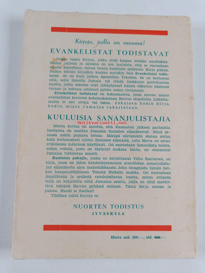 Hyvä. Tarkempi kuntoluokka: K3- ; Pienoista tahraisuutta takakannessa, hieman kulumaa kansissa, hieman rispaantumaa reunoilla ja kulmissa