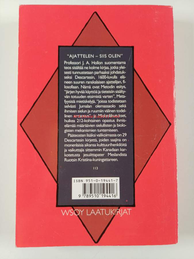 Muu(t) tekijä(t): J A HolloSarja: LaatukirjatAlkuteos: Discours de la methodeAsiasanat: kirjeet, filosofia, filosofit, metafysiikka