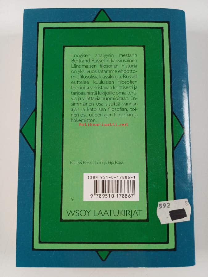 Sarja: LaatukirjatAlkuteos: History of western philosophy and its connection with political and social circumstances from the earliest times to the present dayAsiasanat: historia, oppihistoria, filosofia, uusi aika