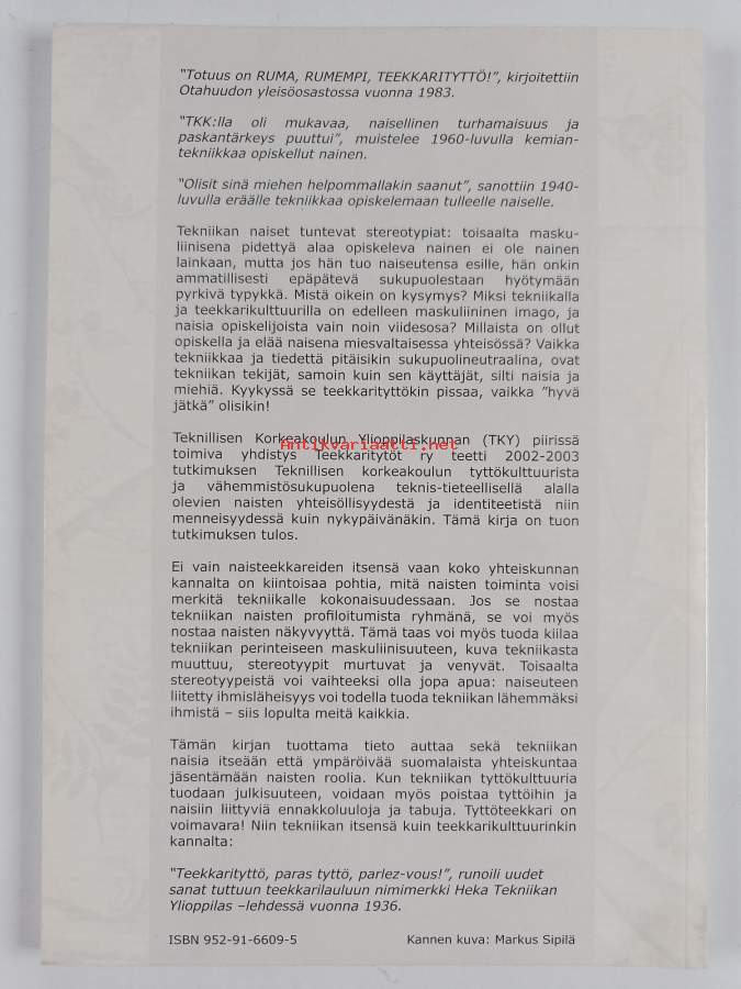 Asiasanat: muistelmat, historia, naiset, naisen asema, asenteet, sukupuoliroolit, opiskelijat, opiskelijajärjestöt, järjestötoiminta, teknologia, naisjärjestöt, korkeakouluopiskelu, stereotypiat, teknilliset korkeakoulut, tekniset alat, memoarer, opiskelijaelämä, kvinnans ställning, könsroller, kvinnor, organisationsverksamhet, teknologi, studentliv, studerande, högskolestudier, attityder, studentorganisationer, tekniska branscher, koulutusvalinnat, tekniska högskolor, stereotyper, kvinnoorganisationer, studieval