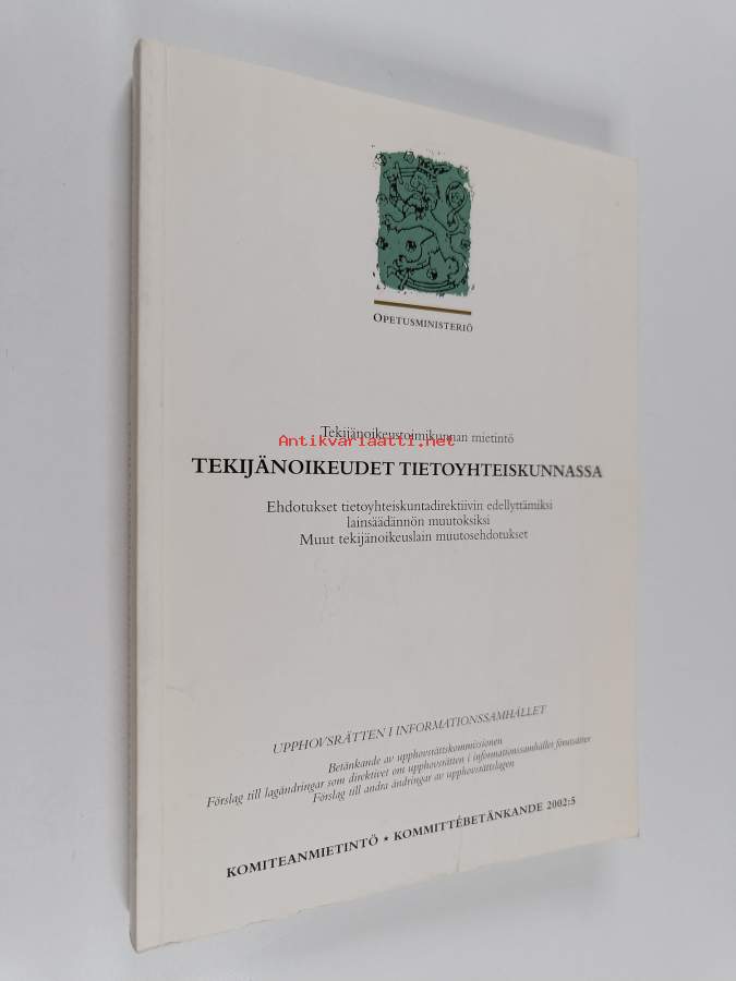 Koko nimi: Tekijänoikeudet tietoyhteiskunnassa : tekijänoikeustoimikunnan mietintö : ehdotukset tietoyhteiskuntadirektiivin edellyttämiksi lainsäädännön muutoksiksi, muut tekijänoikeuslain muutosehdotuksetMerkinnät: ylivedetty omistajamerkintäSarja: Komiteanmietintö 2002:5Asiasanat: tekijänoikeus, tietoyhteiskunta, tietoverkot, EY-oikeus