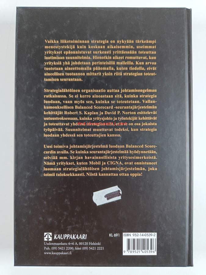 Muu(t) tekijä(t): Margit Heinämäki, David P. NortonAlkuteos: The strategy-focused organizationAsiasanat: organisaatio, ohjausjärjestelmät, strategia, suunnittelu, organisaatiot, strateginen suunnittelu