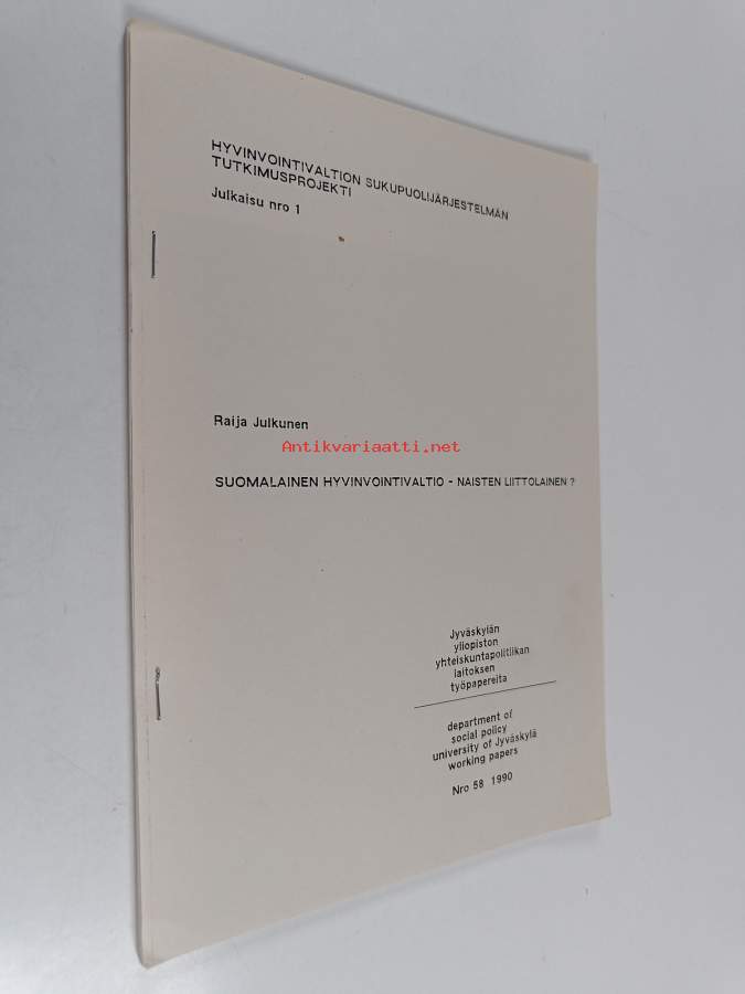 Sarja: Hyvinvointivaltion sukupuolijärjestelmän tutkimusprojekti julkaisu nro 1 ; Jyväskylän yliopiston yhteiskuntapolitiikan laitoksen työpapereita 58Asiasanat: naiset, naisen asema, hyvinvointivaltio, miehet, tasa-arvo, sosiaalipolitiikka, työ, valtio (instituutio), kvinnans ställning, jämställdhet, kvinnor, män, arbete, socialpolitik, välfärdsstat, staten