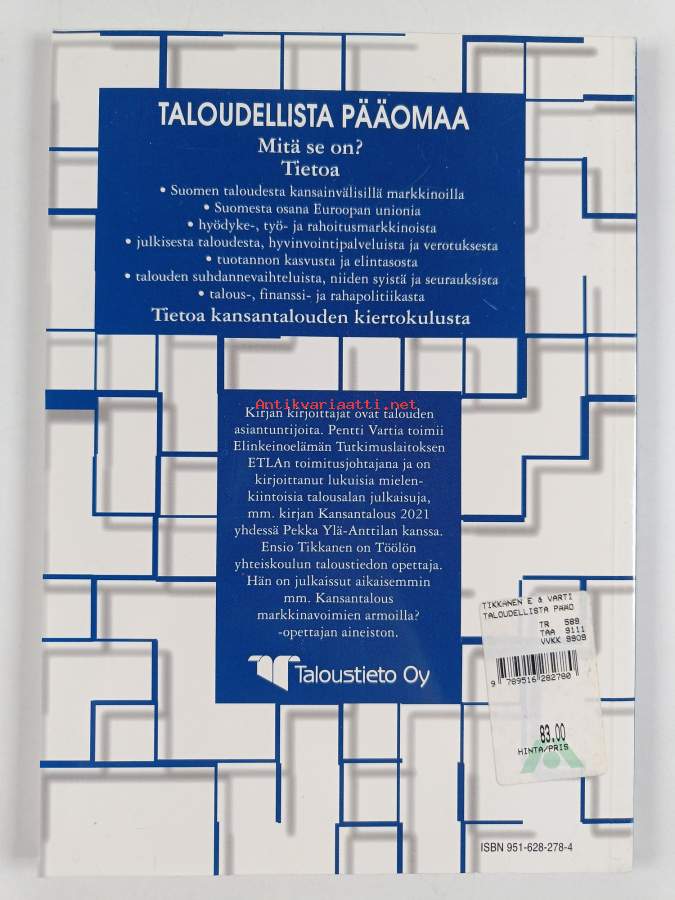 Hyvä. Tarkempi kuntoluokka: K3+ ; Hieman kulumaa kansissa, takana vanha hintalappu