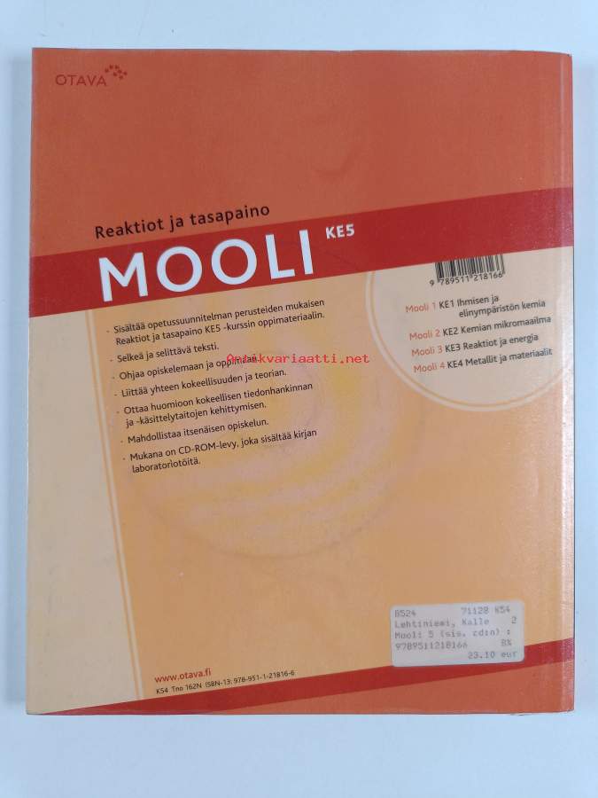 Muu(t) tekijä(t): Juhani Vaskuri, Leena Turpeenoja ym.Sarja: Mooli 5; lukion kemiaAsiasanat: lukio, kemia, oppikirjat, Kemi, tasapaino, pH, hapan laskeuma, kemialliset reaktiot, läroböcker, gymnasiet, suolat, liukoisuus, liuokset, neutralointi, emäksisyys, happamuus (kemia)