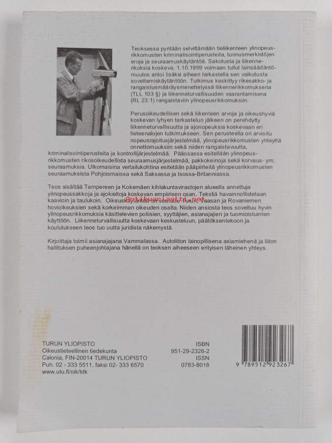 Sarja: Turun yliopiston oikeustieteellisen tiedekunnan julkaisuja, Rikos- ja prosessioikeuden sarja A 29Asiasanat: liikenne, tieliikenne, rikosoikeus, rikkomukset, liikennerikkomukset, seuraamukset, rikesakko, straffrätt, trafik, vägtrafik, förseelser, sakko, liikennerikokset, trafikbrott, påföljder, böter, trafikförseelser, ordningsbot