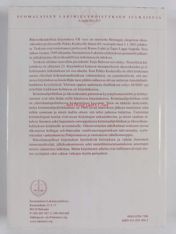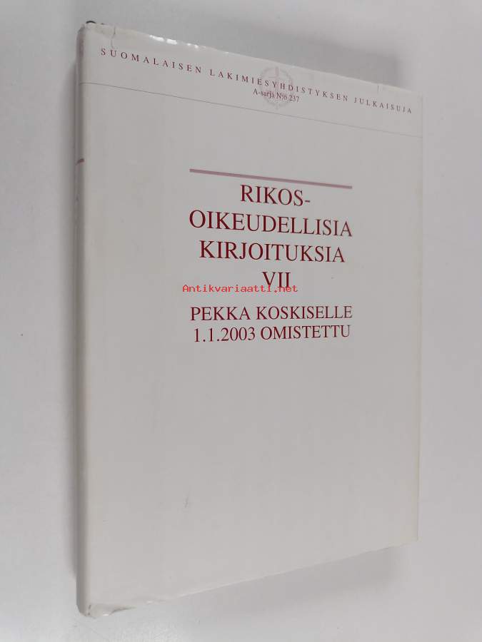 Muu(t) tekijä(t): Raimo Lahti, Eero Backman ym.Sarja: Rikosoikeudellisia kirjoituksia 7; Suomalaisen lakimiesyhdistyksen julkaisuja. A-sarja 237; Suomalaisen lakimiesyhdistyksen julkaisuja : A-sarja 237; Suomalaisen lakimiesyhdistyksen julkaisuja. A-sarja n:o 237Asiasanat: lainsäädäntö, rikokset, oikeushistoria, virkanimitykset, rikosoikeus, oikeuskäytäntö, rangaistukset, oikeudenmukaisuus, nuorisorikollisuus, kriminaalipolitiikka, kriminologia, menettämisseuraamus, rättshistoria, seuraamukset, perätön lausuma, kiristys, juhlajulkaisut, nuori rikoksentekijä, festskrifter, straffrätt, lagstiftning, rättspraxis, utpressning, rättvisa, brott (juridik), straff, ilmianto, kriminalpolitik, ungdomsbrottslighet, tjänsteutnämningar, kriminologi, yleiset opit, förverkandepåföljd, angivelse, osann utsaga