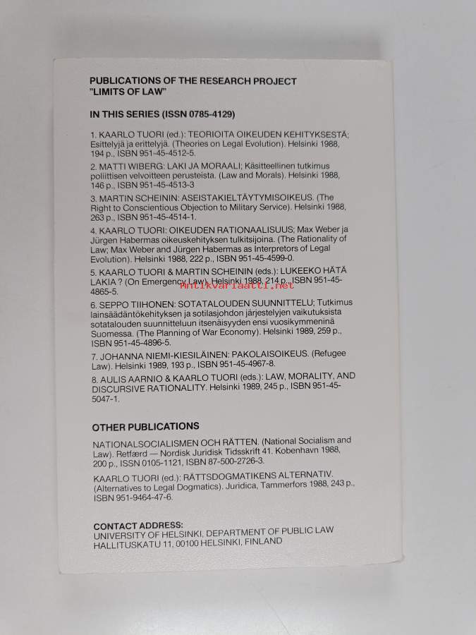 Muu(t) tekijä(t): Kaarlo Tuori, Aulis Aarnio ym.Sarja: Helsingin yliopiston julkisoikeuden laitoksen julkaisuja. D 8Asiasanat: lainsäädäntö, etiikka, yhteiskuntafilosofia, moraali, oikeusnormit, lait, lainkäyttö, yhteiskuntateoriat, laillisuus, legitimiteetti, oikeusfilosofia, rationaalisuus, lakimiehet, etik, rättsfilosofi, samhällsfilosofi, moral, lagstiftning, lainoppi, oikeussosiologia, lagar, rationalitet, rättskipning, Rättssociologi, samhällsteorier, laglighet, legitimitet, oikeuden kehittyminen, rättslära, rättsnormer