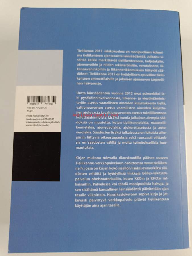 Muu(t) tekijä(t): Sari KorhonenMerkinnät: omistajamerkintä (leima)Sarja: Lakikokoelmat 2012Asiasanat: liikennesäännöt, liikennemerkit, lainsäädäntö, liikenne, ajoneuvot, tieliikenne, tiekuljetus, liikennerikkomukset, lagstiftning, liikennevahingot, trafik, vägtrafik, trafikregler, trafikmärken