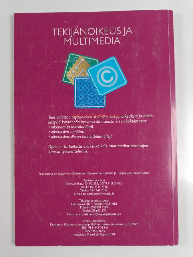 Muu(t) tekijä(t): Tommi NilssonMerkinnät: omistajamerkintäSarja: Kulttuuri-, liikunta- ja nuorisopolitiikan osaston julkaisusarja / Opetusministeriö nro 10/2001Asiasanat: lainsäädäntö, tekijänoikeus, multimedia, uusmedia