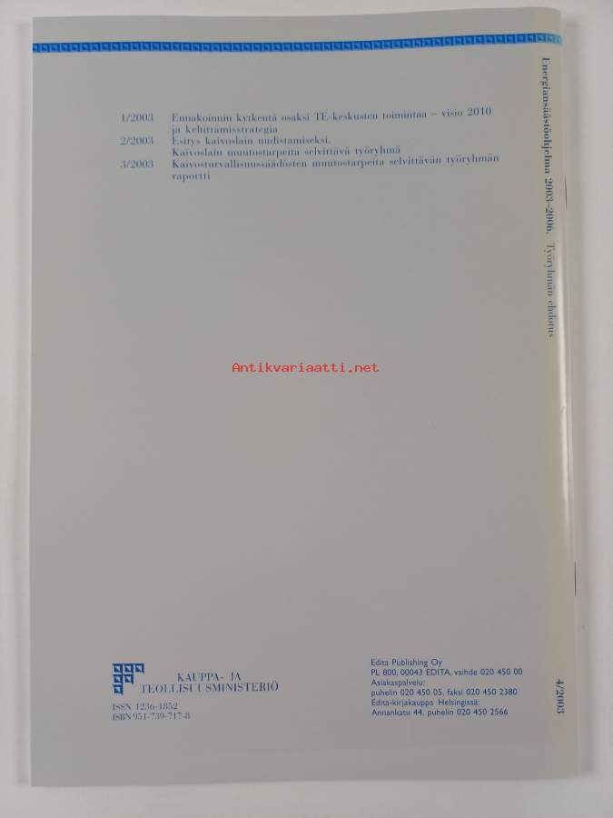 Sarja: Kauppa- ja teollisuusministeriön työryhmä- ja toimikuntaraportteja 4/2003Asiasanat: säästäminen, ilmastonmuutokset, energiankulutus, energiapolitiikka, energiatehokkuus