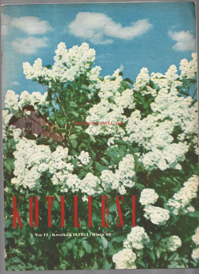 Kotiliesi 1954 nr 12/ Riittoisa raparperi, Kotiruoka vai kaupan tölkki?, Raikasta ja ilmavaa kesäasuun ja sen alle, Puutarhassa on hengähdystauko,